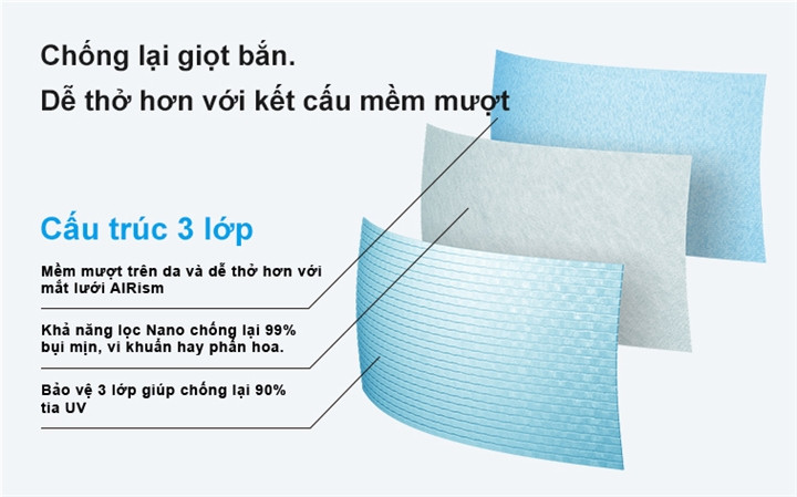 • Chống vi khuẩn và bụi hiệu quả: Lớp lọc giữa ngăn chặn đến 95% vi khuẩn, bụi mịn PM2.5.